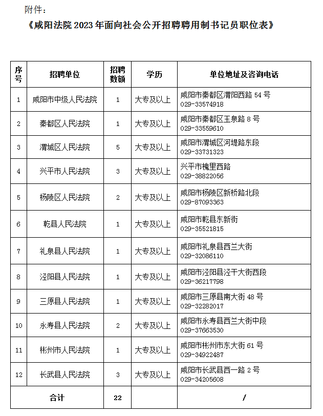 全市法院共招聘聘用制書記員22名,各法院招聘職位、地址及政策咨詢電話詳見《咸陽(yáng)法院2023年面向社會(huì)公開招聘聘用制書記員職位表》(附件)。